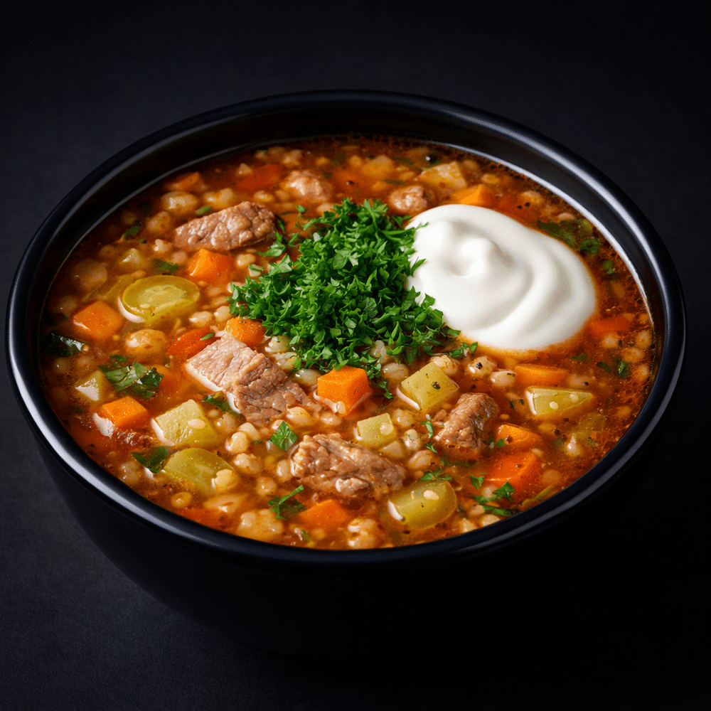 Морковь, лук, картофель, огурцы, свинина, перловка, томатная паста, бульон, петрушка, Сметана