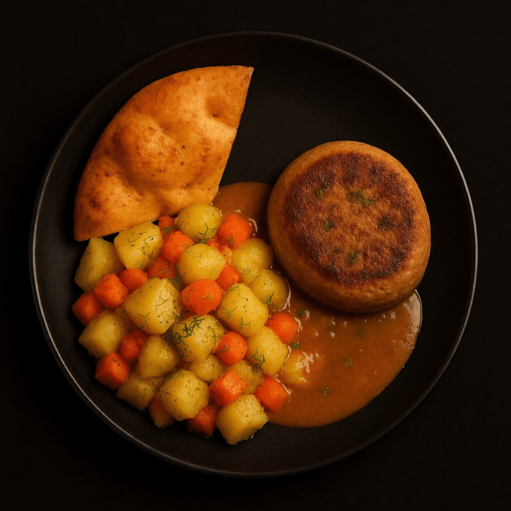 Котлета говядина-свинина,яйца куриные,лук репчатый,сухари панко,молоко,соль,перец черный,картофель,морковка подливка,хлеб"Фокачча"