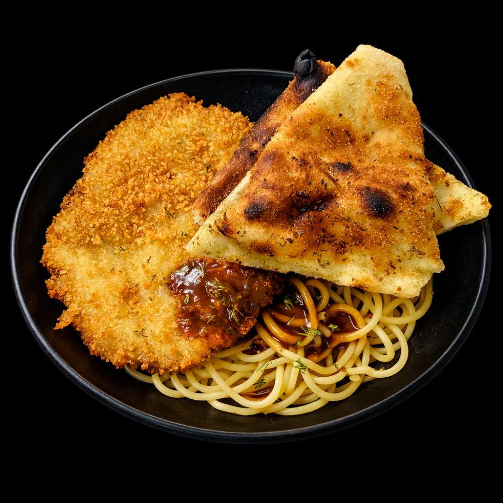 Макароны, соль, куриный шницель, подливка, хлеб"Фокачча"