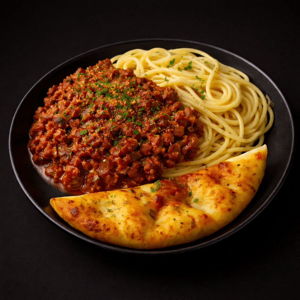 Фарш говяжий, лук, морковка, соус томатный, чеснок, соль, перец, макароны, хлеб"Фокачча"