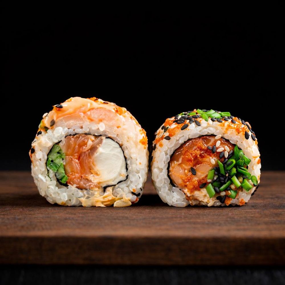 Нори, рис, сыр твороженный, огурец, лосось, креветка, соус спайси, соус терияки, кунжут, тобико, лук