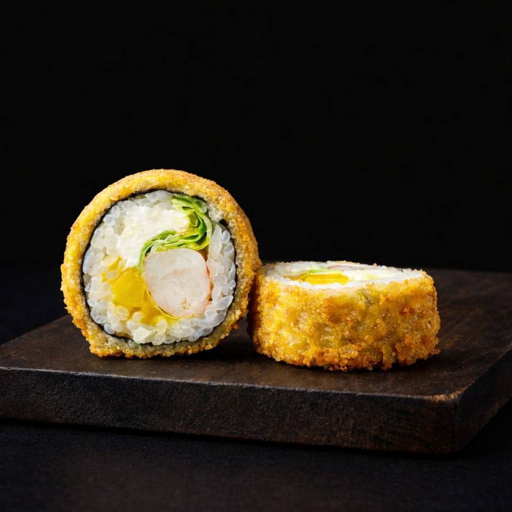 Нори, рис, сыр твороженный, айсберг, креветка, пюре манго, сухари панко, соус спайси