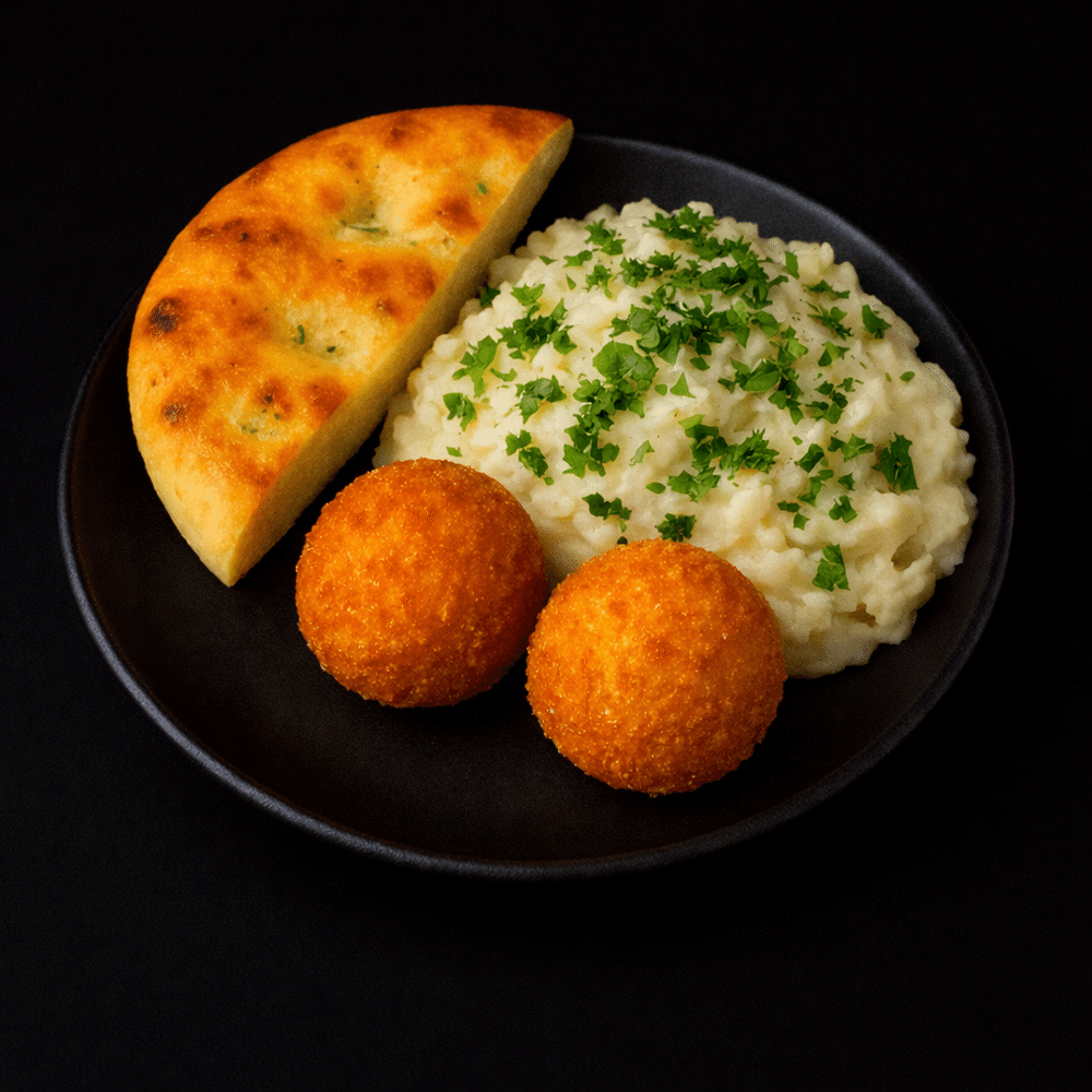 Филе куриное,сыр,молоко,сыр твороженный,сухари панко,соль,сливочное масло,картофельное пюре,чеснок,зелень,хлеб"Фокачча"