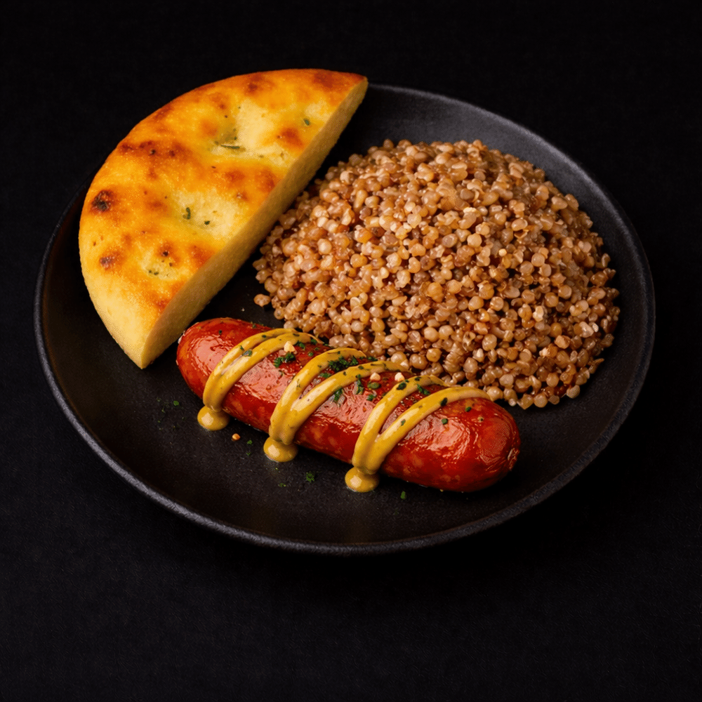гречка, соль, перец, горчица, хлеб фокачча
